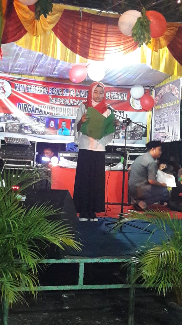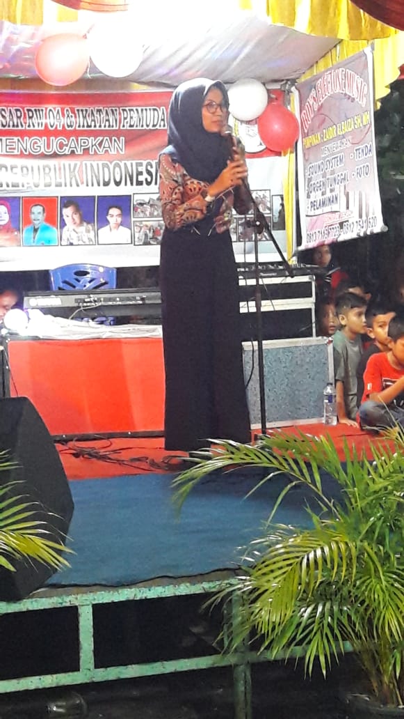 Selain hal itu,Lurah muda ini mengatakan baru ini menghadiri acara kegiatan malam tujuh belasan, ada pembacaan teks proklamasi di atas panggung oleh anak – anak, membuat jiwa ini bergetar dan terharu teringat semasa waktu kecil,dimana setiap acara kegiatan tujuh belasan selalu ada pembacaan teks proklamasi oleh anak-anak di panggung,ini acara bagus sekali.”puji ibu lurah yang cantik ini.