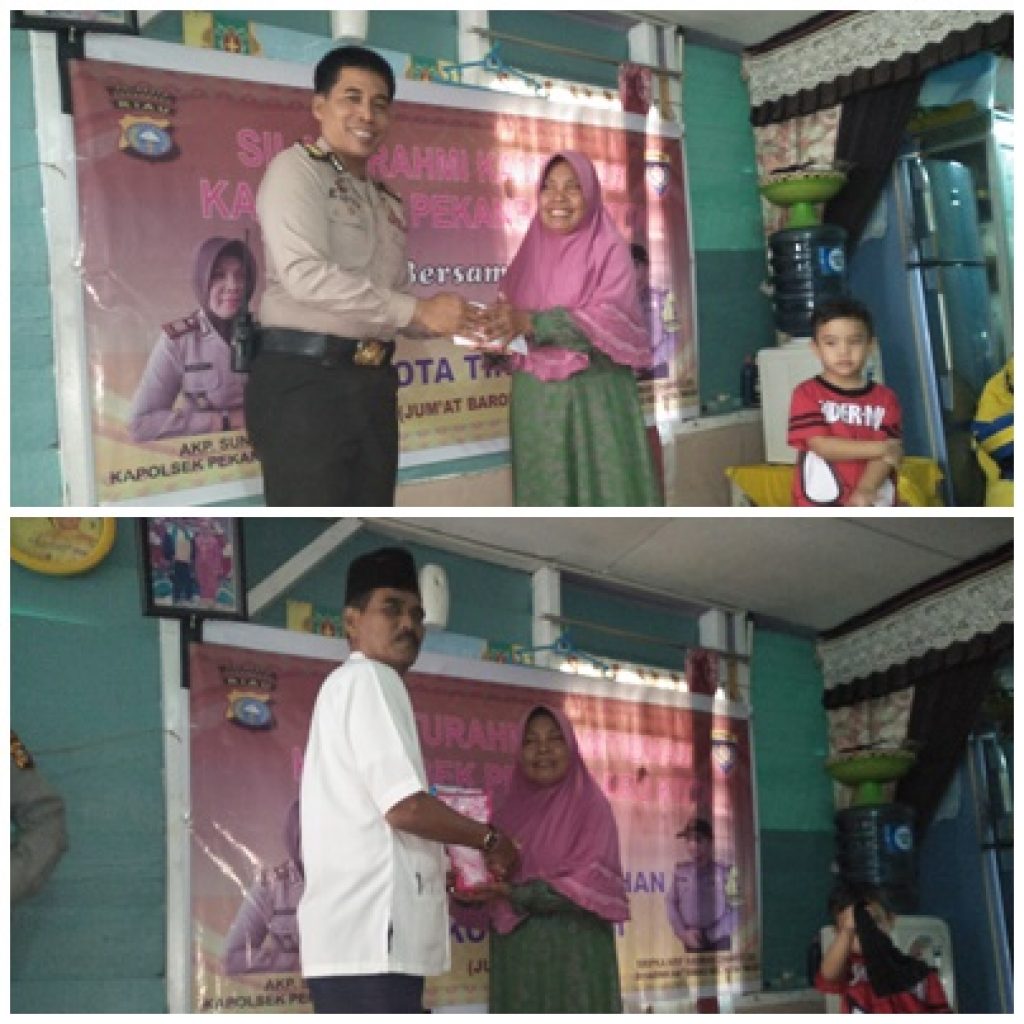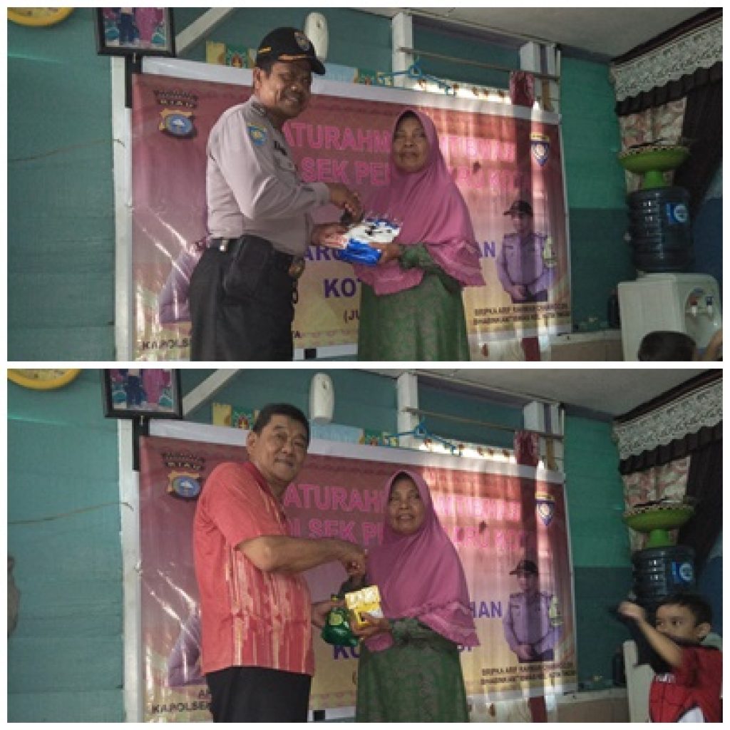Dalam sambang warga ini,Tim Jumat Barokah Polsek Pekanbaru Kota dan Patner’s menyerahkan bantuan uang tuani sebagai tali asih dan sembako berupa10 Kg beras,2 papan telur ayam, 20 liter minyak goreng,teh, Gula, diterjen dan kopi,bantuan ini merupakan hasil iuran anggota Polsek Pekanbaru Kota dan para donatur Jum’at Barokah.