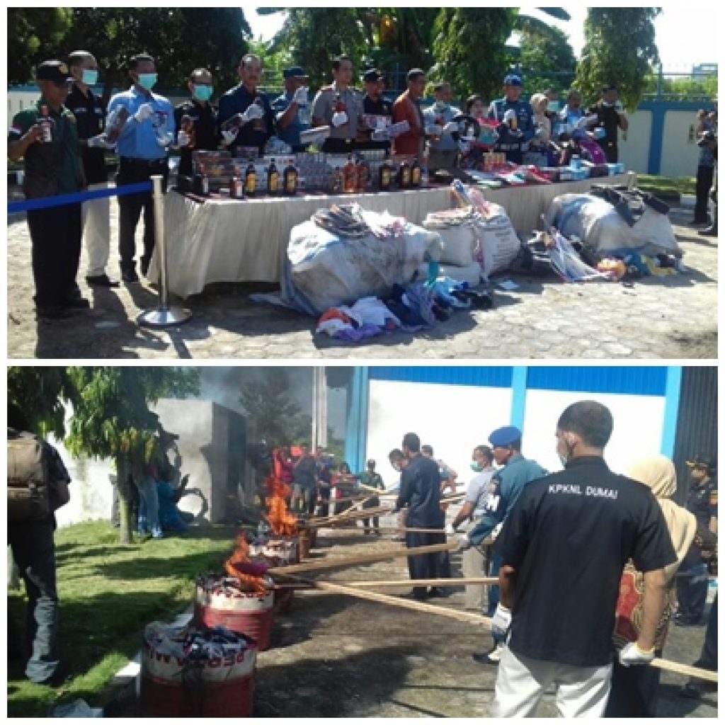 KPPBC Dumai, Fuad Fauzi diwakili Kepala Seksi Penyuluhan dan Layanan Informasi (LI), Gatot Kuncoro bersama Kapolres Dumai, AKBP Andri Ananta Yudhistira Sik MH, pihak Lanal Dumai, Dandim Dumai dan pejabat forkofinda lainnya secara simbolis menyulut api membakar barang hasil penindakan.