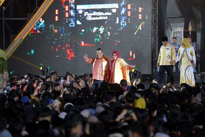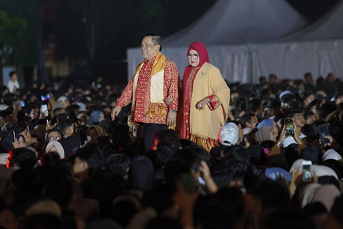 Hal yang menarik perhatian penonton yakni, tampak Pj Gubri SF Hariyanto didampingi istri, berlenggak-lenggok berjalan di atas catwalk. Mereka tampil semringah, serasi, dan percaya diri, menyapa puluhan penonton.