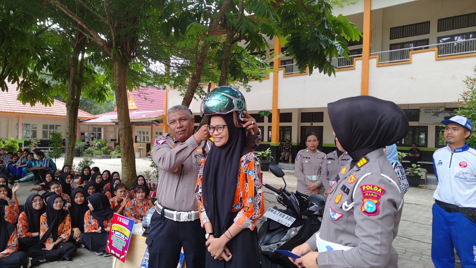 Terpantau di lokasi Kegiatan Kampanye Keselamatan tidak saja diikuti para Siswa dan Siswi SMK 7 Kota Pekanbaru namun juga para guru dan staf, tampak personel Ditlantas Polda Riau memberikan tata cara berkendara bener serta latihan safety riding, selain membagikan brosur himbauan Kamseltibcarlantas dan Kamtibmas, Tim Satgas Preemtif juga membagikan Helm SNI secara gratis kepada para siswa yang berhasil mejawab tentang pertanyaan yang diberikan.