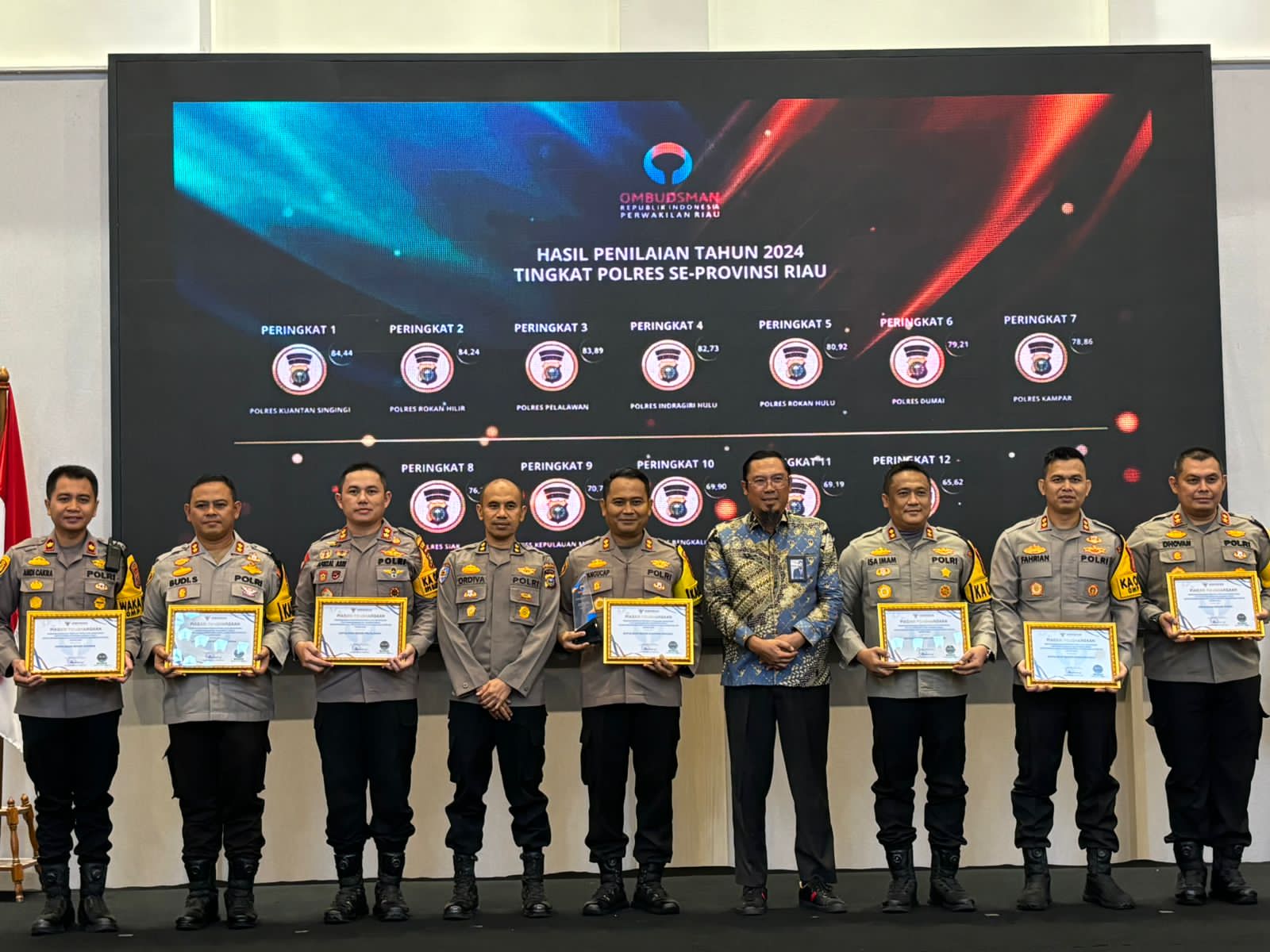 Polres Pelalawan Raih Peringkat III Penganugrahan Predikat Kepatuhan Standar Pelayanan Publik Tahun 2024 Oleh Ombudsman