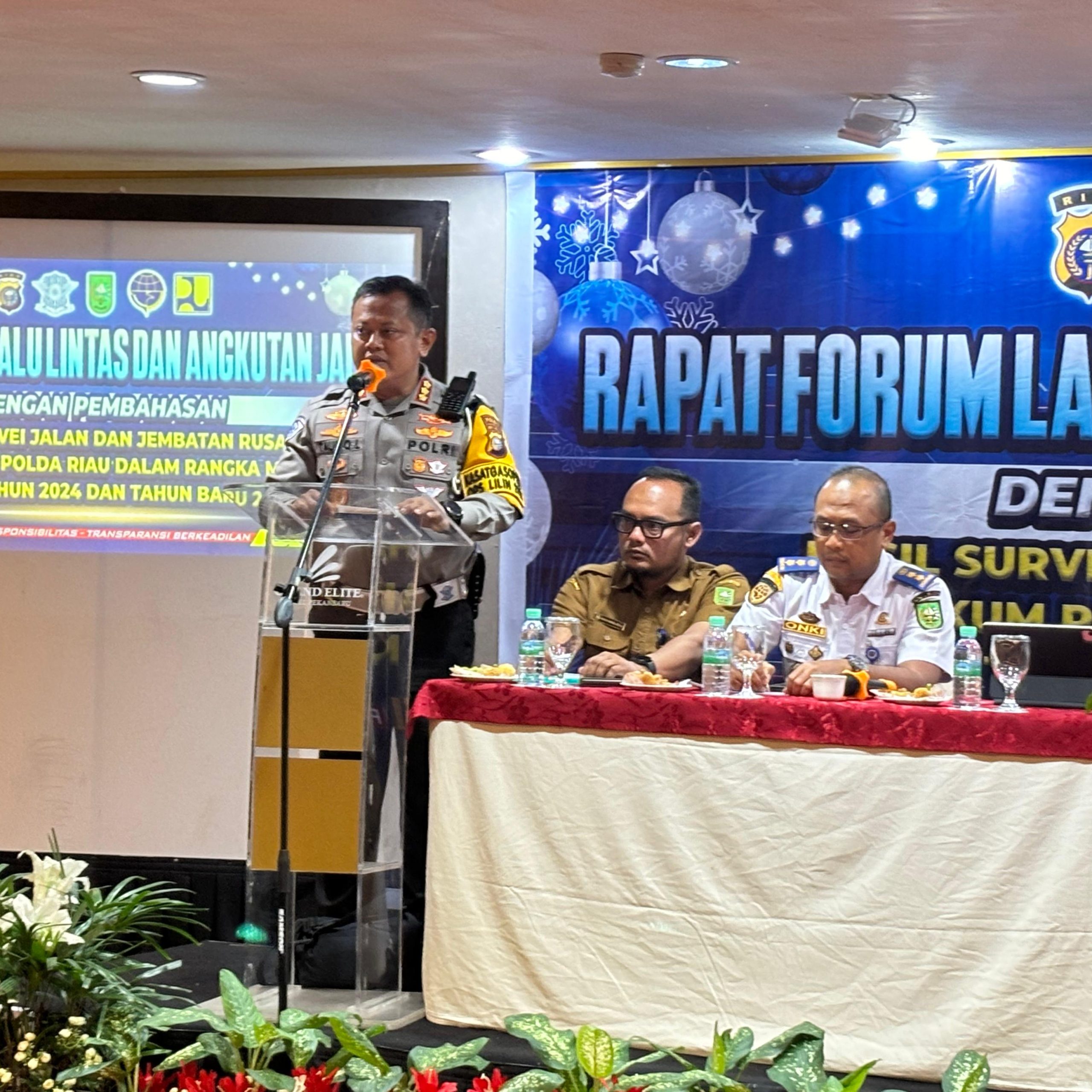 “Dalam kegiatan rapat forum lalu lintas dan angkutan jalan pada hari ini, pokok utama kita membahas hasil survei jalan dan jembatan rusak di wilayah hukum Polda Riau dalam rangka menghadapi perayaan Natal 2024 dan Tahun Baru 2025.” ujar Kombes Pol Taufiq Lukman Nurhidayat.