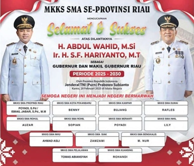 MKKS SMA SE- PROVINSI RIAU MENGUCAPKAN SELAMAT ATAS PELANTIKAN H ABDUL WAHID,M,Si DAN Ir.H.S.F.HARIYANTO,M.T SEBAGAI GUBERNUR DAN WAKIL GUBERNUR RIAU PERIODE 2025 – 2030 OLEH PRESIDEN REPUBLIK INDONESIA JENDRAL TNI (Purn) PRABOWO SUBIYANTO