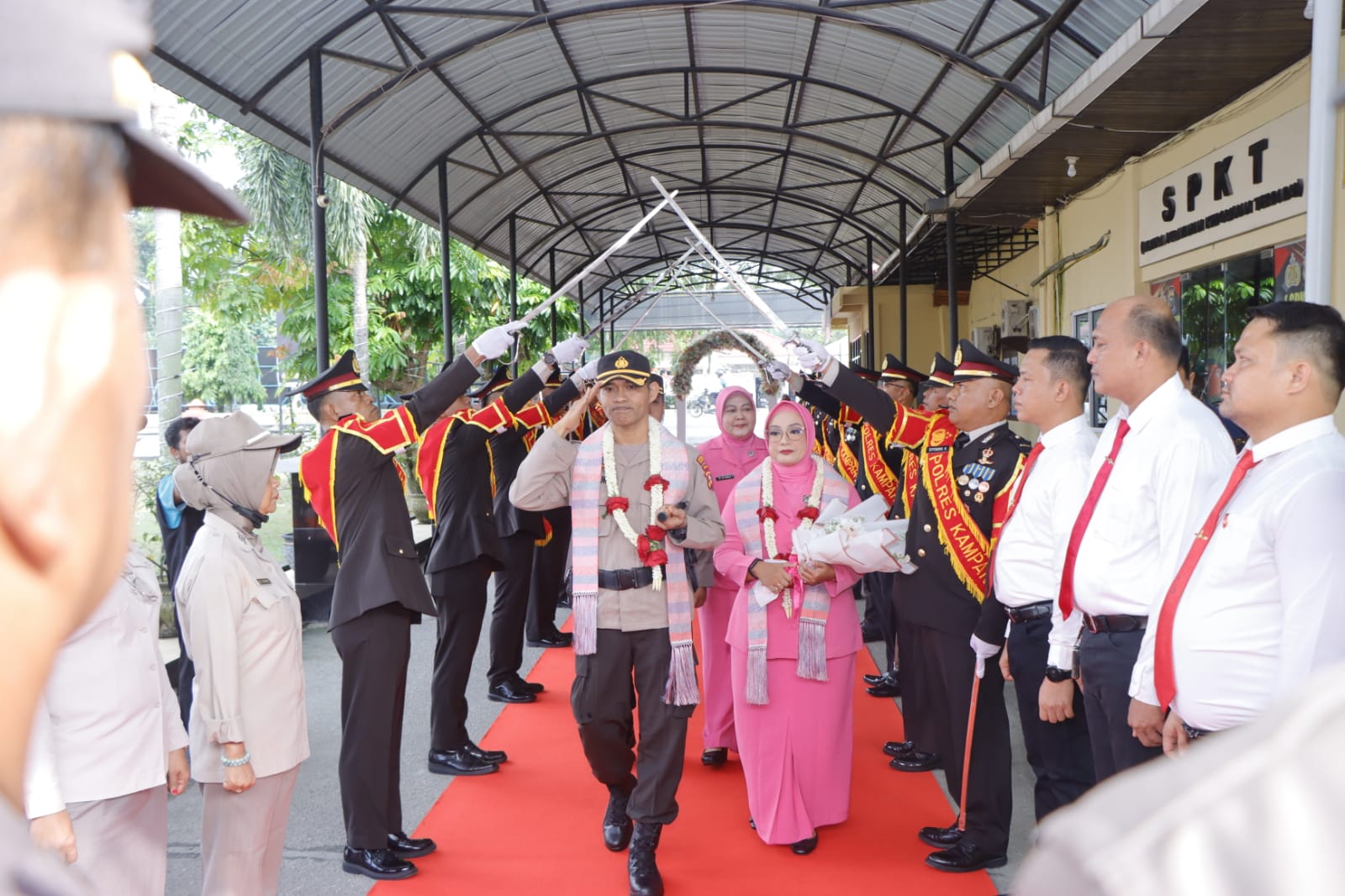 Suasana haru mulai terasa saat AKBP Ronald Sumaja. S.I.K dan Istri memasuki gerbang pora, yang diiringi oleh Kapolres Kampar yang baru bersama Istri. Mantan orang nomor satu di Polres Kampar ini beserta istri, tampak haru dan menahan air mata saat akan berpisah dengan seluruh anggota Polres Kampar.