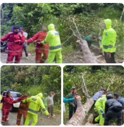 BANGKINANG ,LintasRiauNews. com — Hujan deras yang mengguyur wilayah Bangkinang, Kabupaten Kampar, pada Sabtu (31/5/2025) pagi mengakibatkan sebuah pohon tumbang dan menghalangi jalan lintas Petapahan-Bangkinang dekat Hutan Lindung Kecamatan Bangkinang, Menanggapi kejadian ini, Satuan Samapta Polres Kampar bergerak cepat melakukan evakuasi pohon tumbang tersebut.