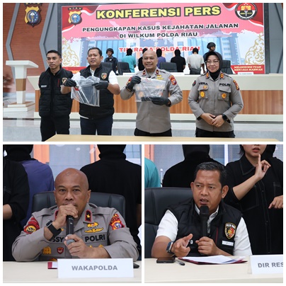PEKANBARU ,LintasRiauNews.com — Polda Riau melaksanakan Konferensi Pers ungkap pelaku kejahatan jalanan yang dipimpin oleh Wakapolda Riau Brigjen Jossy Kusumo, SH, M.Han., didampingi oleh Dir Reskrimum Polda Riau Kombes Pol Asep Darmawan, SH, SIK, PLH Kabid Humas AKBP Vera Taurensa, SS, MH, serta Kasubdit III Jatanras Ditreskrimum Polda Riau AKBP Rooy Noor, SIK, MM, dilaksanakan di Gedung Media Center Polda Riau. Senin, 2 Juni 2025.