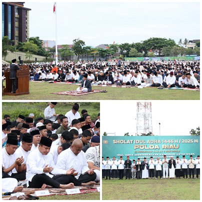PEKANBARU ,LintasRiauNews.com — Ribuan jemaah hadiri pelaksanaan salat Idul Adha 1446 H di halaman Mapolda Riau, Jumat (6/6/2025). Salat Iduladha ini digelar bersama Panitia Hari Besar Islam (PHBI) Kota Pekanbaru.