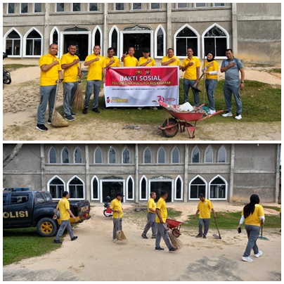 SIAK HULU,LintasRiauNews.com  -– Dalam menjelang memperingati Hari Bhayangkara ke-79, Polsek Siak Hulu menggelar kegiatan Bhakti Religi dan Bhakti Sosial dengan melakukan gotong royong membersihkan areal Masjid Syuhada di Desa Pangkalan Baru, Kecamatan Siak Hulu, Kabupaten Kampar, Sabtu (21/6/2025). Kegiatan yang dimulai pukul 09.00 WIB ini dipimpin langsung oleh Wakapolsek Siak Hulu, AKP Yulius, S.Psi, dan diikuti oleh para Kanit dan personel Polsek Siak Hulu.