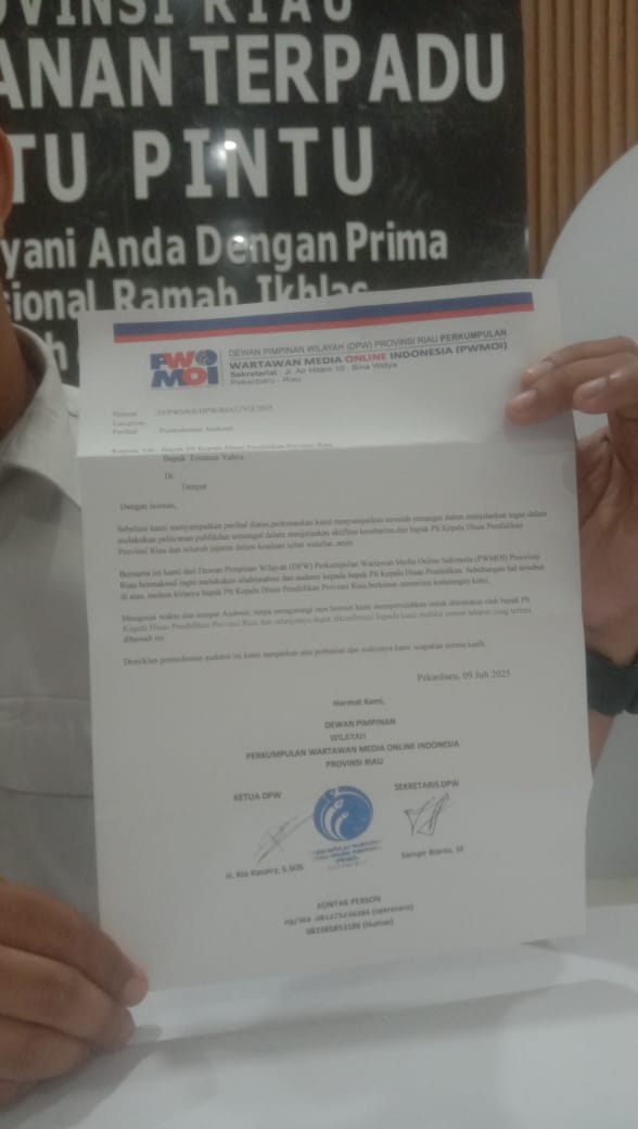 PEKANBARU,LintasRiauNews.com —Dalam menjalin silaturahmi dan komunikasi yang baik, sebagai mitranya dari instansi Swasta maupun pemerintahan, Dewan Pimpinan Wilayah (DPW) Perkumpulan Wartawan Media Online Indonesia (PWMOI) Provinsi Riau melayangkan surat audiensi ke Dinas Pendidikan Provinsi Riau, Rabu (9/7/2025).