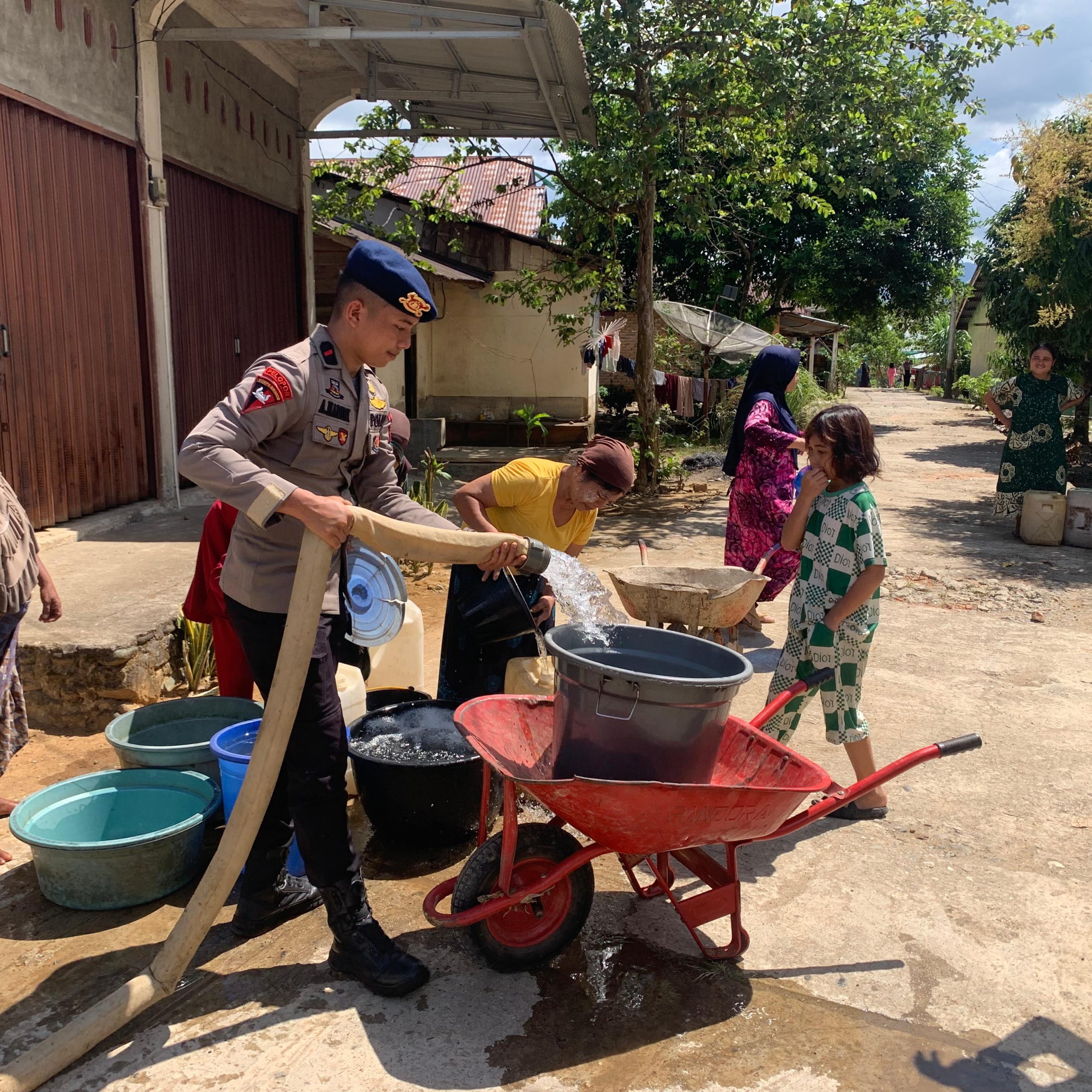 Menindaklanjuti hal tersebut, Polda Sumbar melalui Satuan Brimob Kompi 3 Batalion B Pelopor langsung turun ditengah warga membantu menyalurkan air bersih dengan menggunakan kendaraan Armored Water Canon (AWC), Kamis (10/7).