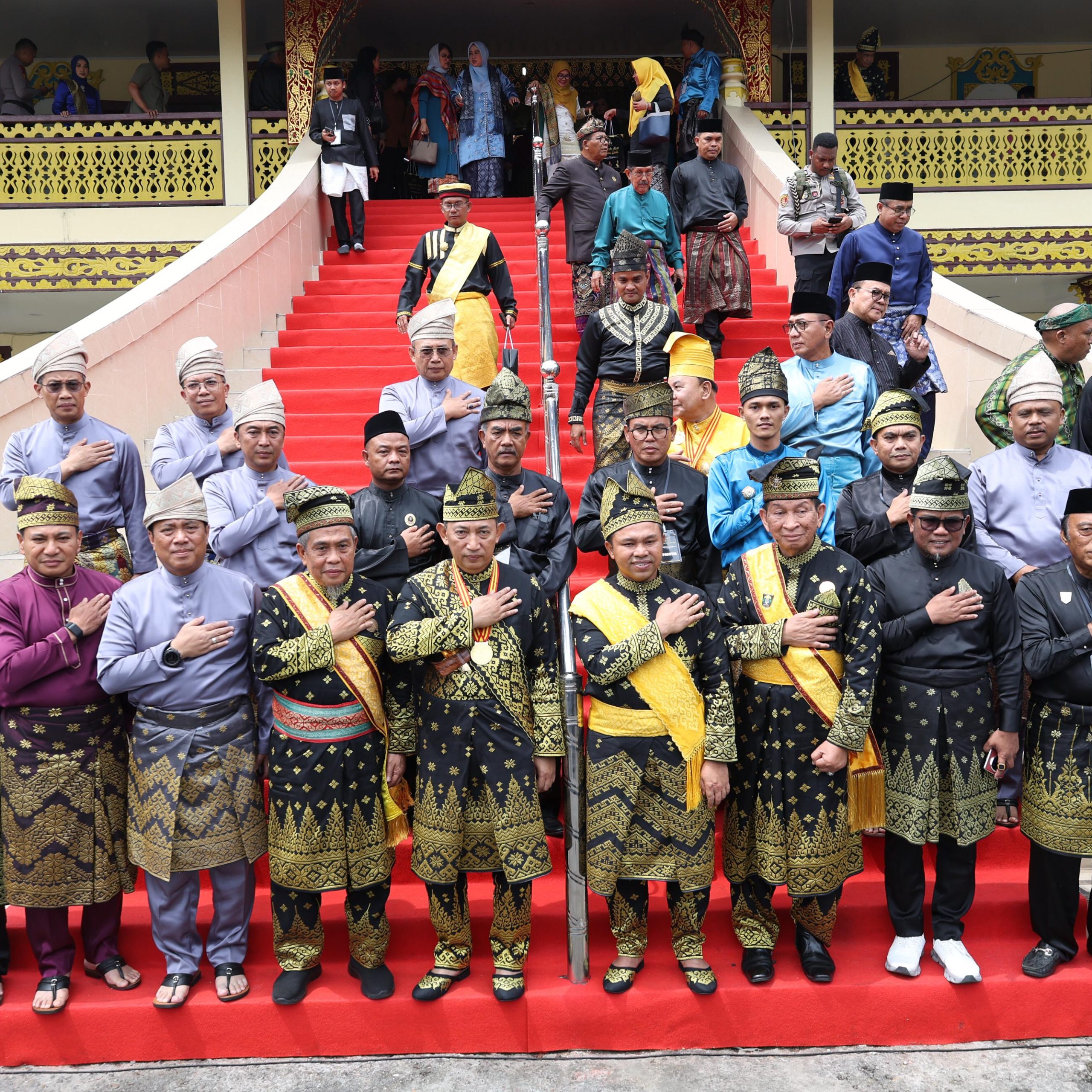 Pemberian Anugerah Adat Ingatan Budi digelar di Balairung Tenas Effendy Balai Adat LAMR, Sabtu (12/7/2025). Jenderal Sigit, Irjen Herry Heryawan, dan Abdul Wahid duduk di tempat prosesi adat (di depan peterakna).