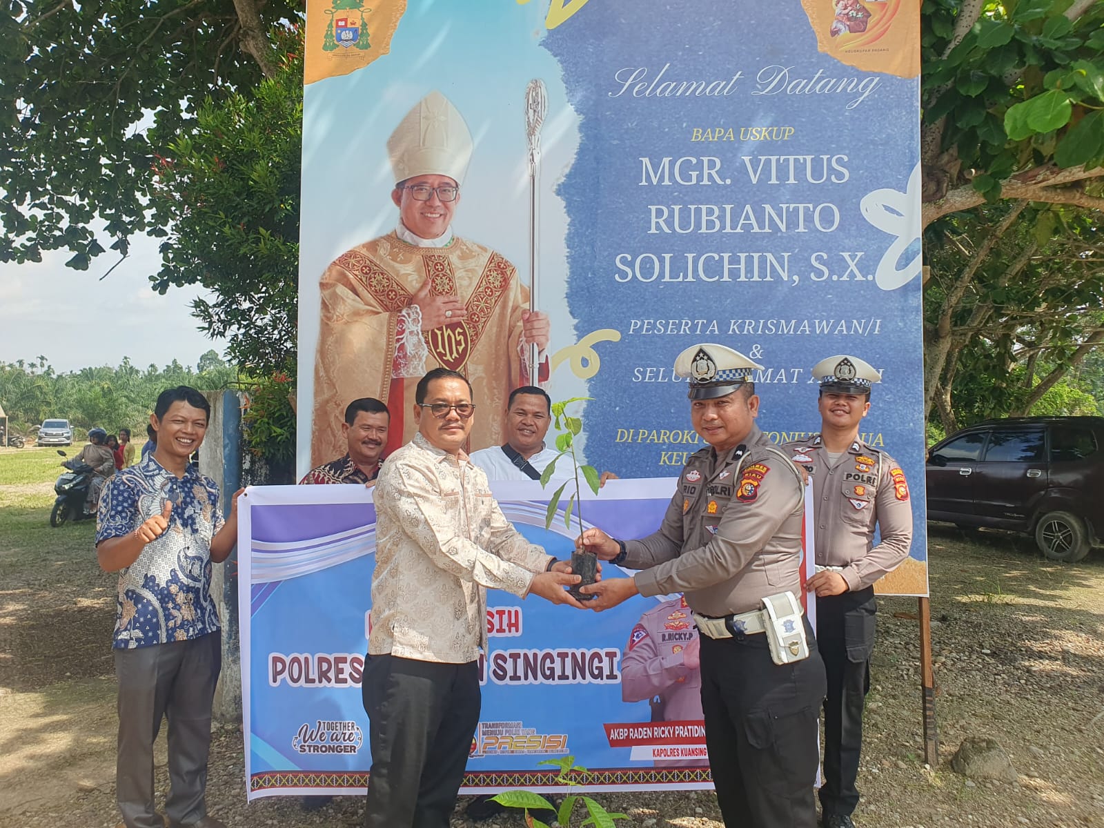 Kegiatan yang berlangsung penuh kekeluargaan tersebut dihadiri oleh personel Sat Lantas Polres Kuansing yakni Aipda Asbanrio, Briptu Yogi Tri Kumoro, dan Bripda M. Zidan Dimarta, serta disambut hangat oleh para pengurus dan jemaat Gereja Santo Antonius Padua.