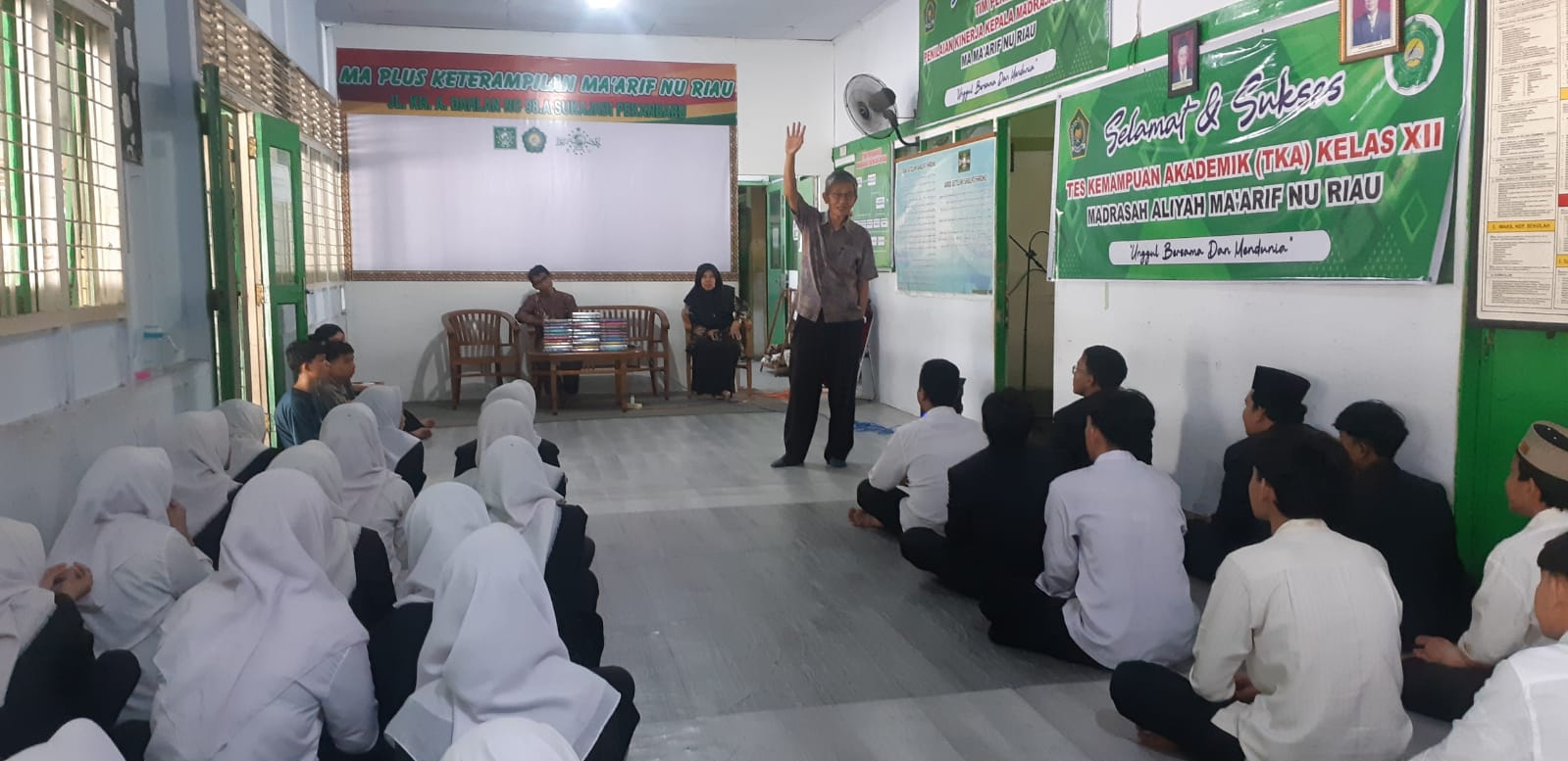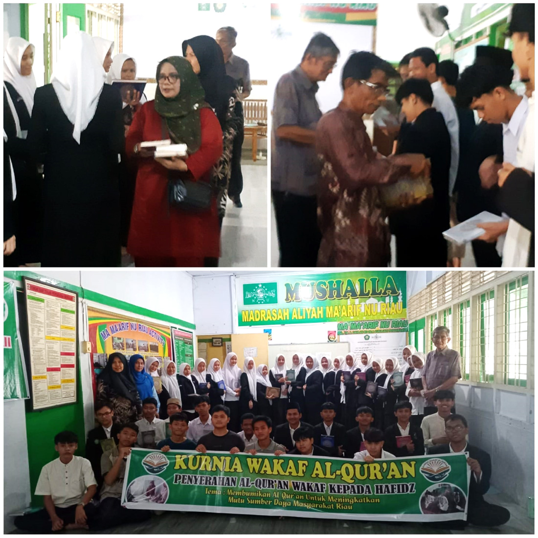 Penyerahan dan pembagian mushaf Al-Qur’an wakaf ini dilaksanakan di aula kantor sekolah yang terletak di Jalan KH Ahmad Dahlan Pekanbaru. Meski digelar sederhana, acara berlangsung khidmat dan bermakna. Dihadiri langsung Kepala MA Ma’arif NU Riau Masita S.Ag, M.Pd yang didampingi Waka Kurikulum Hj. Helmidawati, S.Pd, MM serta sejumlah guru.