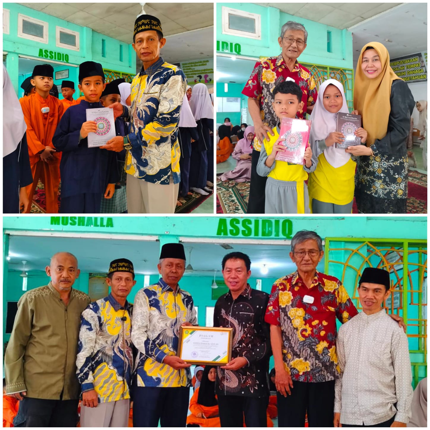Sebagai wujud terima kasih dan rasa syukur, pihak madrasah yang diwakili Nasrun menyerahkan piagam penghargaan kepada komunitas KWQ yang diterima oleh Sadrianto, mewakili pimpinan KWQ. Selanjutnya pembagian mushaf kepada para siswa Tahfidz yang diberikan secara bergilira dan bersama-sama, termasuk oleh para guru. Acara pun diakhiri dengan foto bersama.