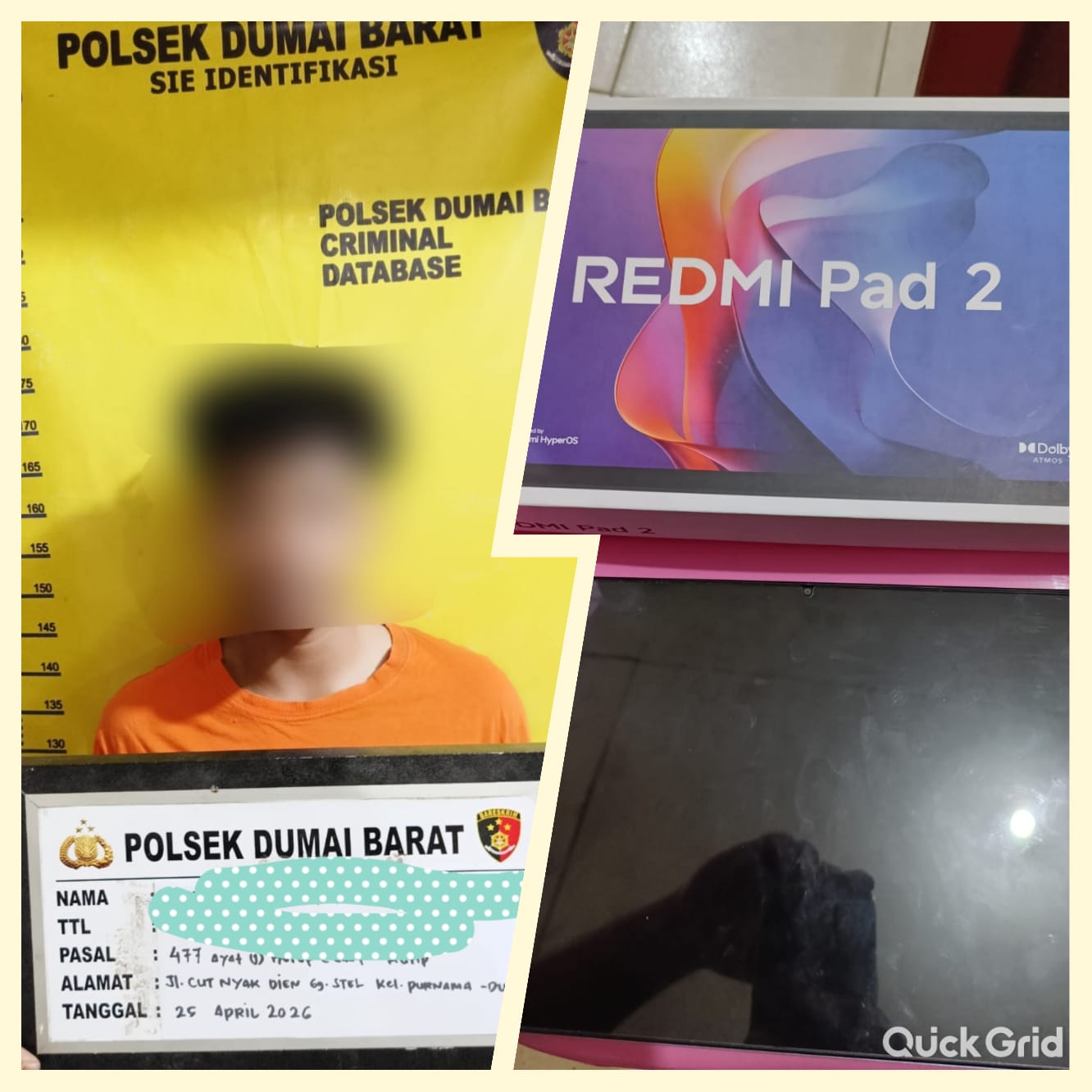 LintasRiauNews.com ,DUMAI — Aksi pencurian yang terjadi saat dini hari di kawasan permukiman Jalan Inpres Gang Haji Malik, Kelurahan Purnama, Kecamatan Dumai Barat, akhirnya berhasil diungkap jajaran Polsek Dumai Barat setelah pelaku memanfaatkan celah jendela rumah warga untuk melancarkan aksinya, Peristiwa tersebut terjadi pada Rabu, 22 April 2026 sekira pukul 03.20 WIB.